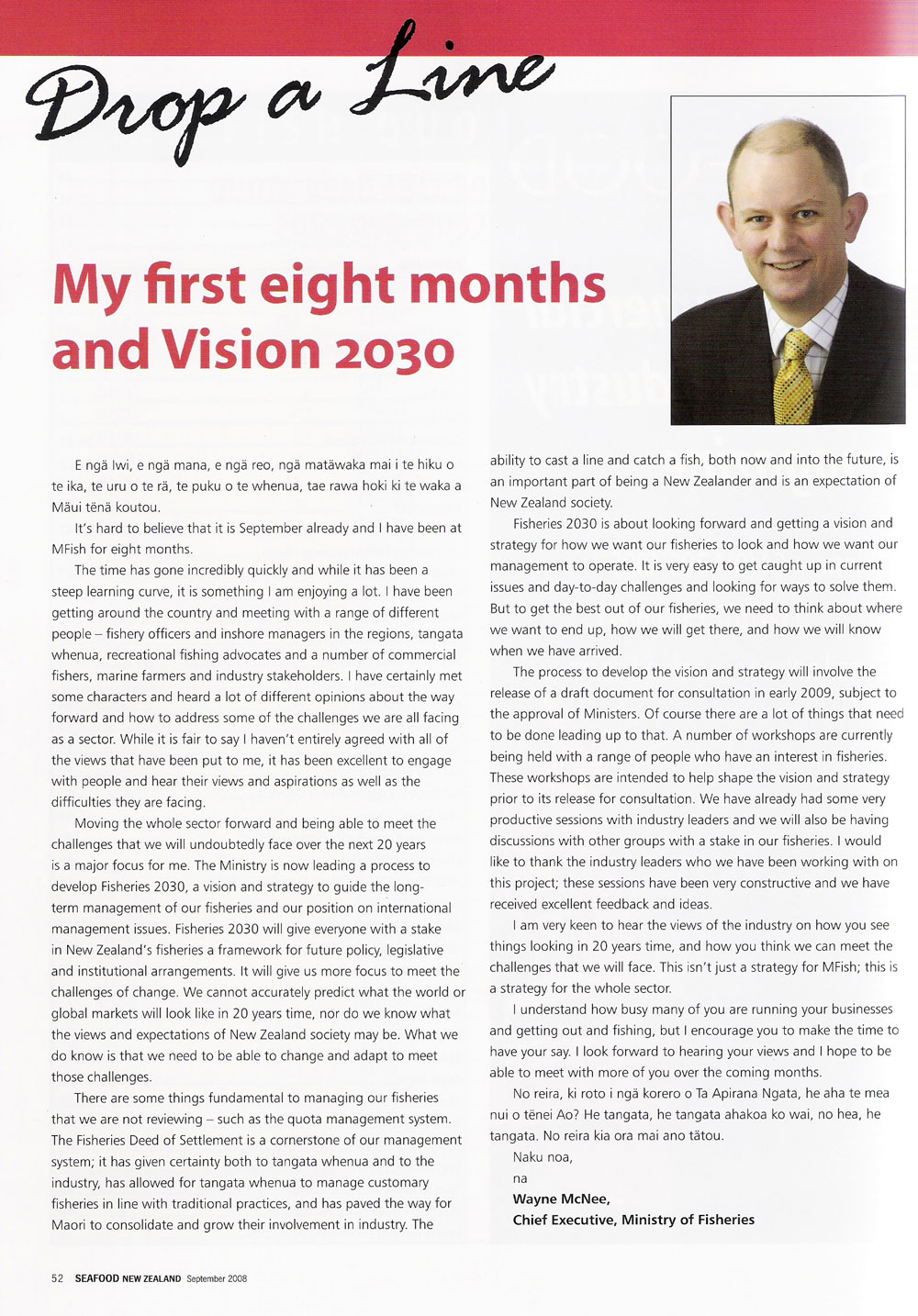 MFish Chief Executive, Wayne McNee, writes a column for the Seafood Industry's September 2008 magazine. McNee discusses the 2030 strategy and that getting "input and participation from tangata whenua and stakeholders is the key to making sure we can effectively plan for the future of our fisheries". |