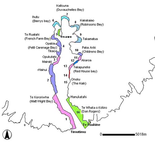 Tikao to Te Ruatahi. Huangi, pipi, kina, tuatua and paua were taken from this area at one time. Sea horses were free to breed at Öpakia at that time but again this area has been frequented by people who use piano wire to strip the rocks bare of all life forms (and take away bucket loads of sea horses). Archaeological evidence has been found of early pre-European Mäori working with whale and shark in the area 4 as marked on the above map.