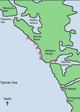 - Marine Park from Papakanui Spit in the North to Port Waikato in the South. Extends into the Manukau Harbour to a line drawn from Laingholm to Mako Point. Extends from Mean High Water Springs (MHWS) to 4nm seaward.