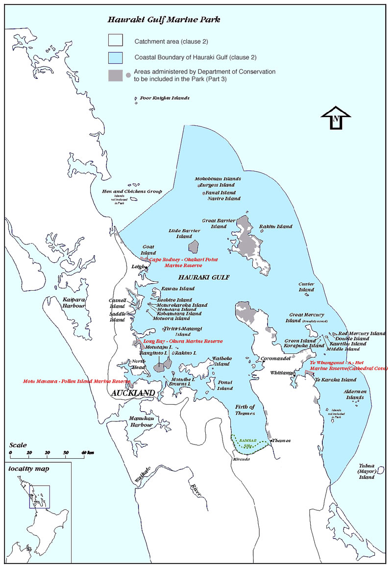 | Hauraki Gulf Forum boundaries The Hauraki Gulf Marine Park featured highly in the Kahawai Legal Challenge proceedings. There is an obligation on the Minister to have particular regard to this special area, which extends from Bream Tail in the north to the Bay of Plenty in the South. (Right. Click on map icon for a larger image) |