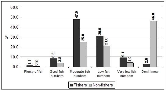 Fishery quality and fish abundance are related, but differ because of factors other than abundance that affect fishery quality, including items such as fish size, fish condition, catchability, environmental conditions, species mix, and so forth. Only about 6% of survey respondents thought fish abundance was better than moderate (Figure 2), although about one third of respondents gave a don't know response (46% for non-fishers). Nearly 60% of fishers rated abundance as moderate or better, while only 29% of non-fishers were of the same opinion.