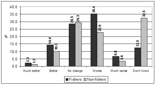 Marine fisheries were considered to be in the worst condition of all the environment sectors that were addressed in the perceptions survey. People appeared to be less well informed about marine fisheries than other environment sectors, with questions about marine fisheries receiving the highest frequency of don't know responses.