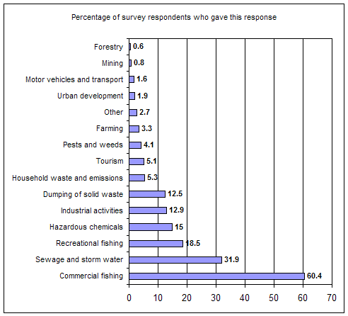 Respondents' judgements of the main causes of damage to marine fisheries are reported in Figure 6. Sixty percent of respondents viewed commercial fishing as a major contributor of damage to marine fisheries. One third of respondents attributed fisheries damage to sewage and storm water. While recreational fishing was seen to be an important cause of damage, it was significantly less important than either of these other items.