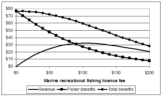 One advantage of a licence fee is that it generates revenue for fishery management. The quantum of revenue generated is dependent on the level at which the licence fee is set. Figure 10 illustrates this dependency. Total benefits are the sum of revenue from licence sales and benefits obtained by active recreational marine fishers (fisher benefits). Fisher benefits decline as the licence fee increases because some fishers quit fishing, while for others benefits decline by the cost of the licence.